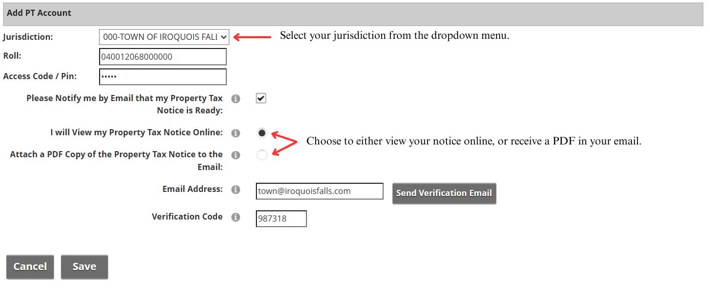 - Access Code / PIN: Enter your PIN as shown on the paper copy of your most recent tax notice. If you do not have a PIN, contact the Town of Iroquois Falls either in-person at Town Hall (253 Main Street, Iroquois Falls, ON P0K 1G0) or by telephone at (705) 232-5700.